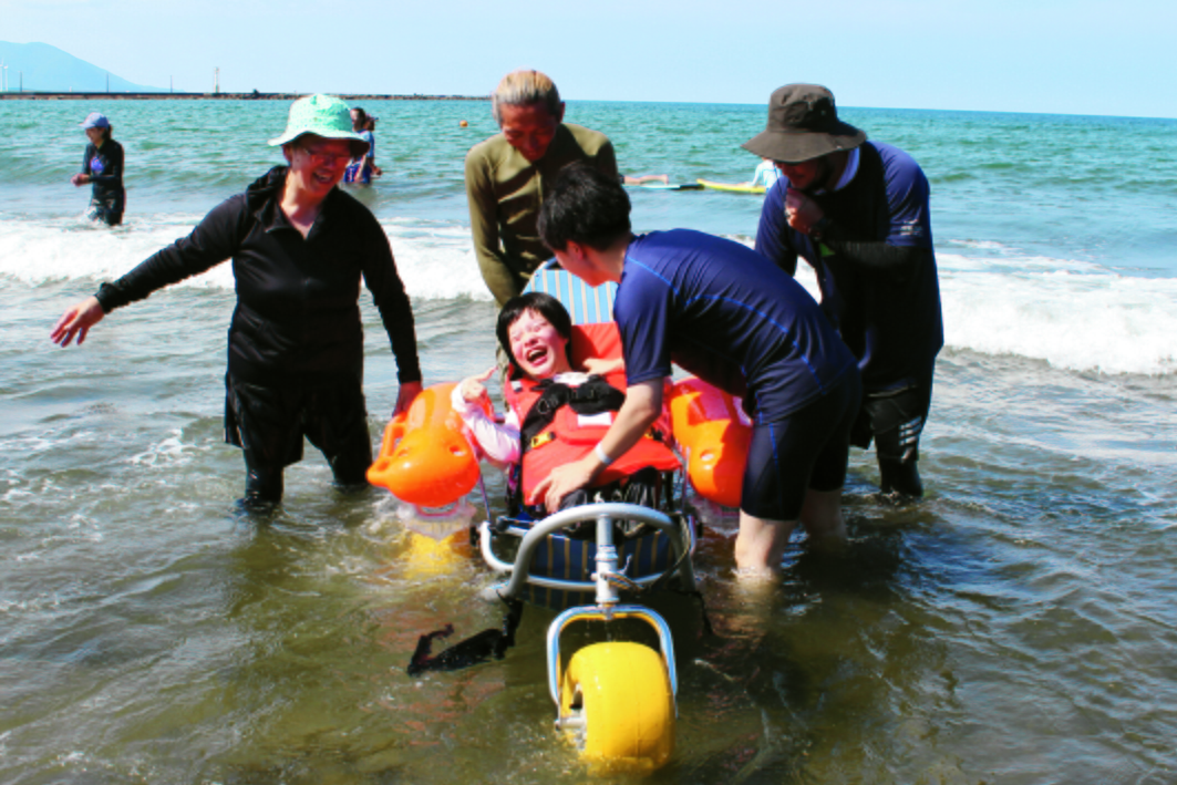 今年も多くの方の協力の元、子ども達を中心に楽しんでもらおうと、8月23日(土)に「海からのおくりもの2025」を三国のヨットハーバー、並びにサンセットビーチ等で開催しました。本年は新しくユニバーサルビーチ体験が追加され、水に浮く水陸両用の車イスが、砂浜に登場しました。昨年までの「東尋坊遊覧船体験」・「ヨット体験」・「はまぐり掘り体験」・「漁師体験」・「堤防釣り体験」・「カニ釣り体験」・「サーフィン体験」・「スイカ割り体験」・「フラダンス体験」は今年もあり、その内のいくつかには健常者だけではなく、障がいのある方のための福祉枠も設けました。普段は海での遊びに抵抗がある方々にも、この事業を通して海の楽しさや素晴らしさを少しでも体験してもらいたいとの想いからの試みで、当日は多くの方に喜んでいただいたのではないかと思います。
