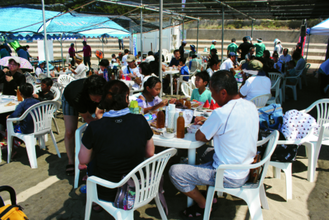その後の大試食会では、ワカメの粉をつけたおにぎりや、サザエのつぼ焼き、ところてんなどがあり、参加者たちは地元の食材に舌鼓をうちました。試食会